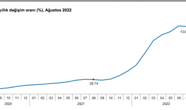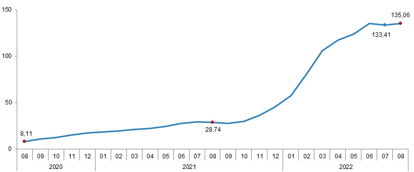 Tarım-GFE'de (2015=100), 2022 yılı Ağustos ayında bir önceki aya göre %1,64, bir önceki yılın Aralık ayına göre %86,45, bir önceki yılın aynı ayına göre %135,06 ve on iki aylık ortalamalara göre %88,48 artış gerçekleşti.
