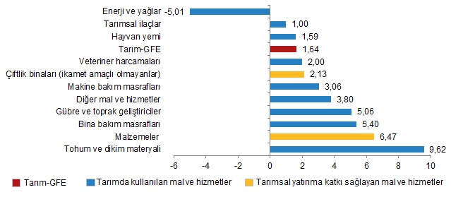 Yıllık artışın düşük olduğu alt gruplar sırasıyla, %36,20 ile veteriner harcamaları ve %62,97 ile diğer mal ve hizmetler oldu. Buna karşılık, yıllık artışın yüksek olduğu alt gruplar ise sırasıyla, %234,48 ile gübre ve toprak geliştiriciler ve %184,77 ile enerji ve yağlar oldu.