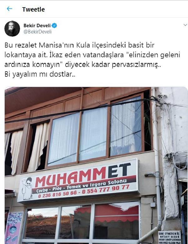ÜNLÜ televizyon programcısı Bekir Develi, Manisa'daki bir lokantanın 'Muhamm-et' isimli tabelasına sosyal medya hesabından tepki gösterdi. Vatandaşlar tepkiye hak verip eleştirince, zabıta ekipleri tabelayı indirdi.Televizyon programcısı Bekir Develi, Kula'da faaliyet gösteren bir lokantanın 'Muhamm-et' isimli tabelasını Twitter hesabından eleştirdi. Develi, hesabından yaptığı paylaşımda, 'Bu rezalet Manisa'nın Kula ilçesindeki basit bir lokantaya ait. İkaz eden vatandaşlara 'Elinizden geleni ardınıza koymayın' diyecek kadar pervasızlarmış. Bi yayalım mı dostlar' yazdı. Ülke genelinde birçok kişi, Develi'ye hak verdi. Bir kullanıcı, 'Edep yahu. Nerede çocuklarına yüksek sesle bağırırım endişesi içinde Peygamber Efendimizin ismini vermekten çekinip, Mehmet ismini veren sahabeler' yazdı.Eleştiriler giderek artarken Kula Belediyesi Zabıta Müdürlüğü personeli ise bu sabah lokantayı denetledi. Yapılan incelemelerin ardından 'Muhamm-et' isminin yer aldığı tabela, zabıtalar tarafından indirildi.Kendi isminin Muhammet olmasından dolayı lokantaya bu ismi verdiğini söyleyen işletmeci Muhammet Kurnaz, önceki yıllarda 'Nil' lokantası olarak hizmet verdiklerini, 3 yıl önce iş yerinde yapılan tadilat çalışmalarının ardından isim değişikliği yaptıklarını söyledi. Hiçbir kötü düşünce gözetmeden kendi ismini lokanta ismi olarak kullandığını ifade eden Kurnaz, babası ile birlikte 18 yıldır aynı yerde hizmet verdiklerini belirtti.DHA