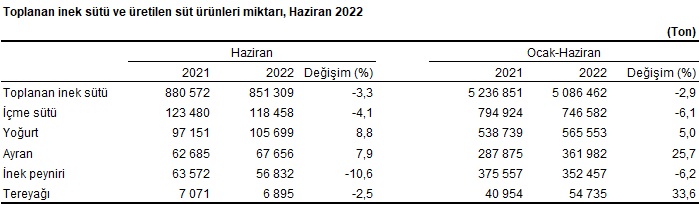 Ocak-Haziran döneminde bir önceki yılın aynı dönemine göre, tereyağı üretimi %33,6, ayran üretimi %25,7, yoğurt üretimi %5 artarken; inek peyniri üretimi % 6,2, içme sütü üretimi %6,1 ve toplanan inek sütü miktarı %2,9 azaldı.