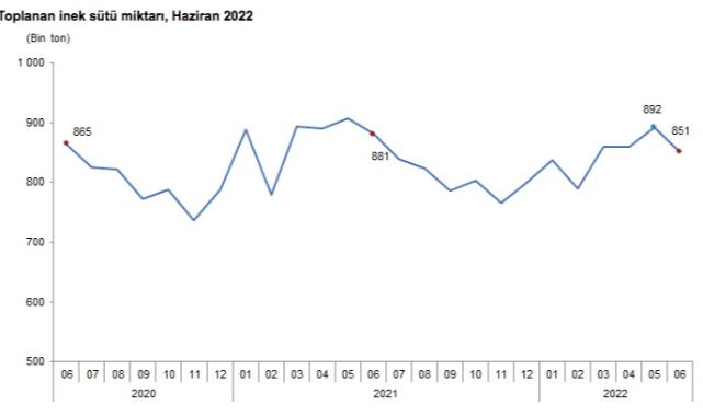 Bir önceki ay 891 bin 709 ton olan ticari süt işletmelerince toplanan inek sütü miktarı Haziran ayında %4,5 azalarak 851 bin 309 ton oldu.Toplanan inek sütü miktarı, Haziran 2022
