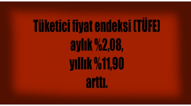 Tüketici fiyat endeksi (TÜFE) aylık %2,08, yıllık %11,90 arttı.