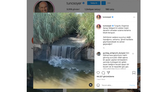 İzmir Büyükşehir Belediye Başkanı Tunç Soyer, bugün sosyal medya hesabından bir paylaşım yaptı. Soyer, atıksuların sulama kanalına karıştığı bir video paylaşarak, Turgutlu Organize Sanayi Bölgesi’nin atıkları hiçbir denetim olmadan sulama kanalına böyle karışıyor. Zehirlenen sadece suyumuz değil, toprağımız, soframız. Şimdi harekete geçmeyeceksek ne zaman geçeceğiz? şeklinde bir paylaşım yaptı. Kısa sürede on binlerce izlenen paylaşıma, vatandaşlar yüzlerce yorum yazdı. Hasan Deniz ÇİZMECİ