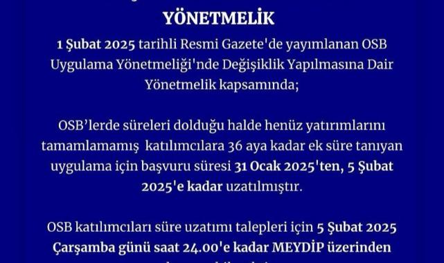 Turgutlu 1. Bölge OSB Katılımcılarına Süre Uzatımı Duyurusu1 Şubat 2025 tarihli Resmî Gazete’de yayımlanan OSB Uygulama Yönetmeliği’nde Değişiklik Yapılmasına Dair Yönetmelik kapsamında, Organize Sanayi Bölgeleri’nde (OSB) yatırım süresi dolmasına rağmen henüz tamamlanmamış projeler için 36 aya kadar ek süre tanıyan başvuru süresi 31 Ocak 2025’ten, 5 Şubat 2025’e kadar uzatıldı.OSB katılımcıları, süre uzatımı taleplerini 5 Şubat 2025 Çarşamba günü saat 24.00’e kadar MEYDİP üzerinden iletebilecek.OSBÜK – Organize Sanayi Bölgeleri Üst Kuruluşu Etiketler:#Turgutlu #OSB #Sanayi #Yatırım #TurgutluOSB