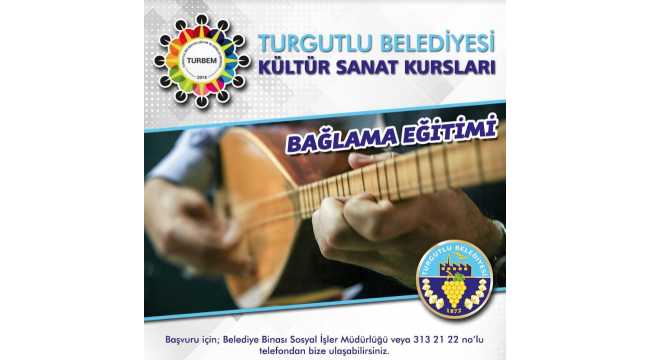 Turgutlu Belediyesi her yıl düzenlediği kültür ve sanat kurslarının kayıtlarına bu yıl da başladı. Sosyal İşler Müdürlüğü bünyesinde açılan,Türk Halk Müziği, Bağlama, Satranç ,Halk Oyunları ve Tiyatro kurslarına kayıtların başladığını belirten Turgutlu Belediye Başkanı Çetin Akın “ Kültür ve Sanat kurslarımıza kayıtlarımız başladı. Kurslara katılmak isteyen vatadaşlarımız Sosyal İşler Müdürlüğü’müze başvurarak ücretsiz olarak kurslardan faydalanabilir” dedi.Turgutlu Belediyesi tarafından her yıl düzenlenen kültür ve sanat kurslarına yeni dönem kayıtları başladı. Haftanın belirli günlerinden düzenlenecek olan kurslardan vatandaşları ücretsiz olarak faydalanabileceğini belirten Turgutlu Belediye Başkanı Çetin Akın “her yıl olduğu gibi bu yıl da kültür ve sanat kurslarımıza başladık. Kayıtlarımız devam ediyor. Türk Halk Müziği, Bağlama, Satranç ,Halk Oyunları ve Tiyatro kurslarına kayıt yaptırmak ve bilgi almak isteyen vatandaşlarımız Belediyemiz Sosyal İşler Müdürlüğü’ne bavurmaları yeterlidir” dedi.