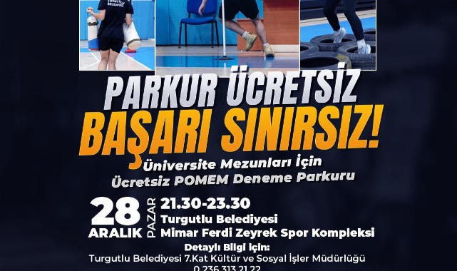 Turgutlu Belediyesi, gençlerin kamu kurumlarındaki istihdam süreçlerine daha donanımlı hazırlanabilmeleri amacıyla üniversite mezunlarına yönelik ücretsiz Polis Meslek Eğitim Merkezi (POMEM) deneme parkuru programı başlatıyor. 28 Aralık Pazar günü gerçekleştirilecek deneme parkuruna, Turgutlu Belediyesi Mimar Ferdi Zeyrek Spor Kompleksi ev sahipliği yapacak.