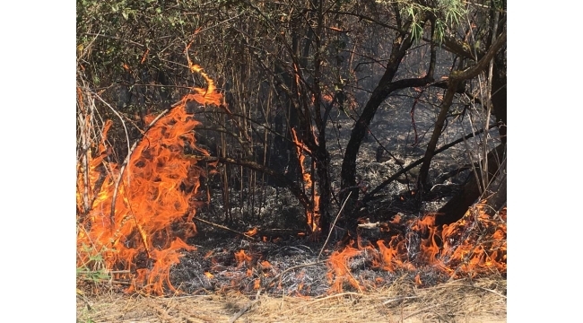 Irlamaz Deresi yatağında yaklaşık 20 dönümlük bir alanda henüz bilinmeyen bir nedenle çıkan yangında meyve ve zeytin ağaçları yandı.
