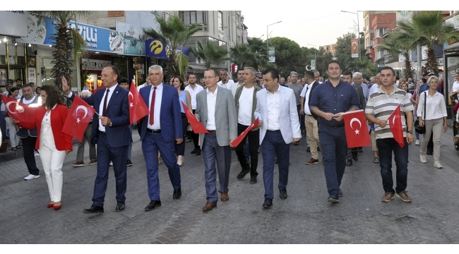 TURGUTLU İlçesinde 30 Ağustos Zafer Bayramı’nın 97’nci yılı kutlamaları kapsamında ‘Büyük Zafer Yürüyüşü’ gerçekleştirildi. 30 Ağustos Zafer Bayramı’nın 97.yılına özel 970 metre uzunluğunda Atatürk ve Türk Bayrağı ile gerçekleştirilen kortej yürüyüşüne Kaymakam Ali Yılmaz, CHP Manisa Milletvekili Bekir Başevirgen, Garnizon Komutanı Albay Kenan Peşternik, Belediye Başkanı Çetin Akın, İlçe Emniyet Müdürü Alparslan Demiray, İlçe Jandarma Komutanı Halim Karaer, oda başkanları, sivil toplum kuruluşları temsilcileri ve çok sayıda vatandaş katıldı. Koza Pazarından başlayan kortej yürüyüşü, 15 Temmuz Demokrasi Şehitleri Alanına kadar devam etti. Korteji gören Atatürk Bulvarı'ndaki vatandaşlar da el sallayarak sevgi gösterisinde bulundu. Doğan ÇİZMECİ
