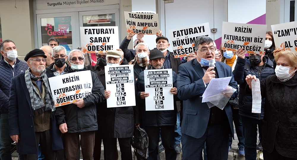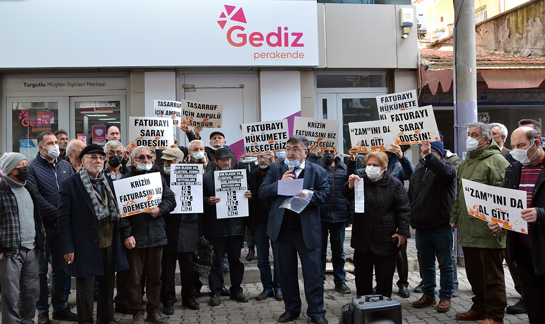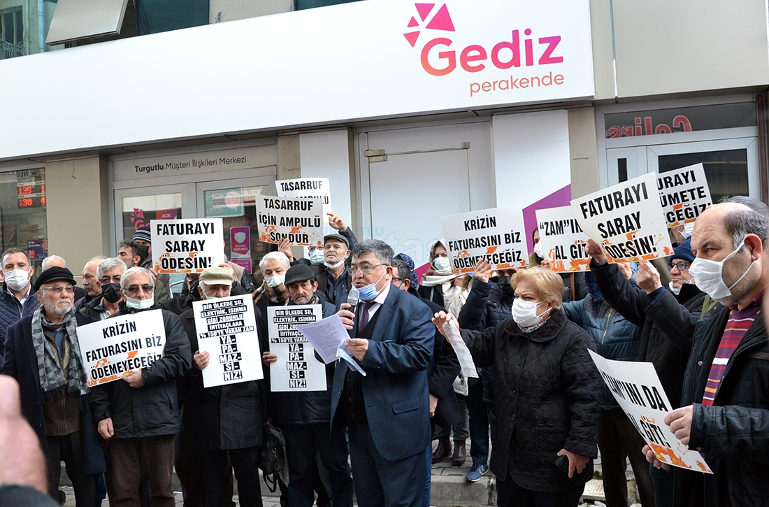 CHP Turgutlu İlçe Teşkilatı Başkanı Hüseyin Oğuz ve yönetimi, CHP Turgutlu Belediye Meclis Üyesi Fehmi Gülen ve partililer, son zamanlarda elektriğe, doğalgaza ve akaryakıta gelen zamları protesto etmek için GDZ Elektrik Dağıtım A.Ş.’nin binası önünde bir araya gelerek basın açıklaması gerçekleştirdiler. Açıklamada, ‘faturayı saray ödesin’, ‘faturayı hükümete keseceğiz’, ‘Zam’ını da al git!’, ‘krizin faturasını biz ödemeyeceğiz’, ‘tasarruf için ampulü söndür’ yazılı dövizlere hükümete tepki gösterilip zamlar protesto edildi.