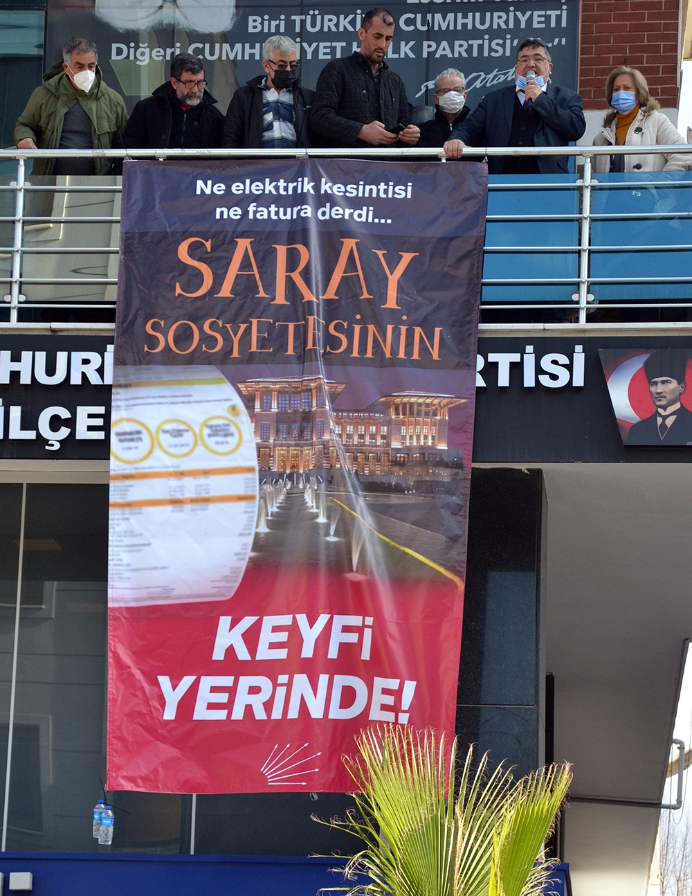 Partililer, açıklamanın ardından olaysız şekilde dağılırken, parti binasına ‘Ne elektrik kesintisi, ne fatura derdi. Saray sosyetesinin keyfi yerinde’ yazılı pankart asıldı.