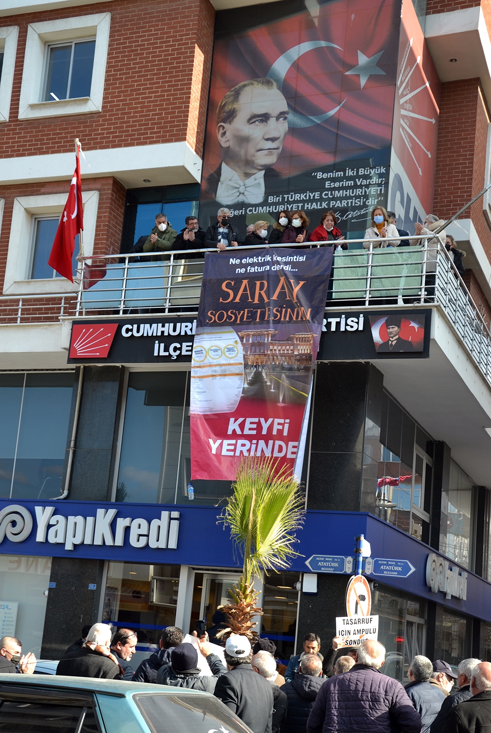 Protestonun ardından CHP Turgutlu İlçe Teşkilatı binasına ‘Ne elektrik kesintisi, ne fatura derdi. Saray sosyetesinin keyfi yerinde’ yazılı pankart asıldı.