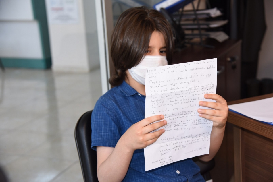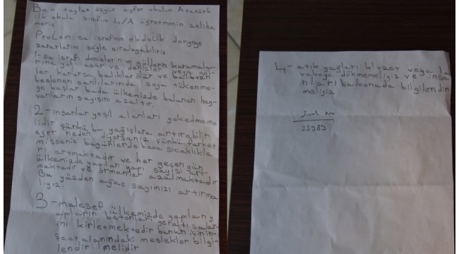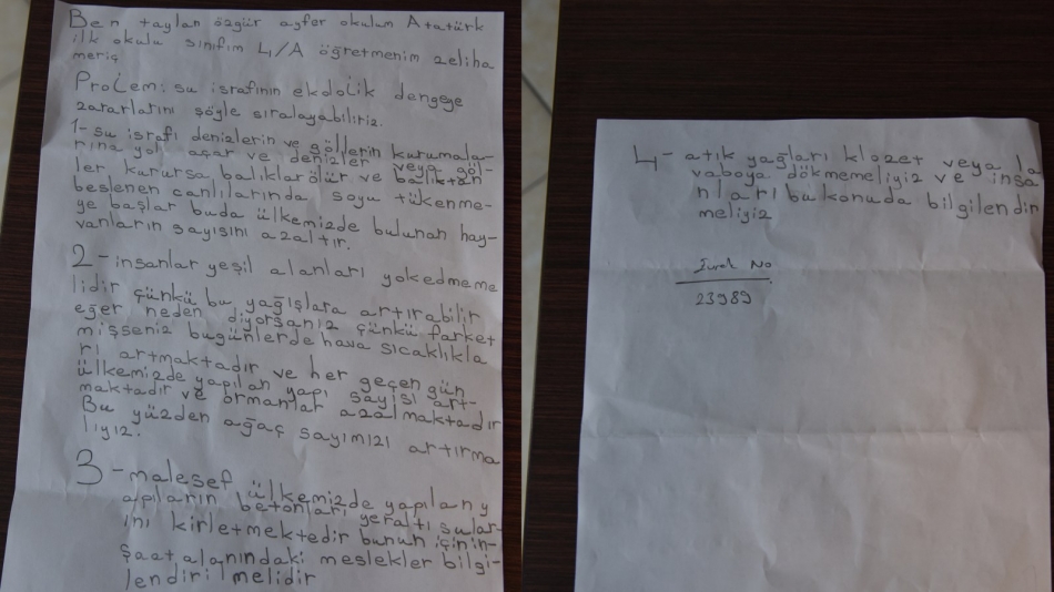 Taylan Özgür Ayfer, yazmış olduğu mektubunda, “Ben Taylan Özgür Ayfer. Okulum Atatürk İlkokulu. Sınıfım 4-A. Öğretmenim Zeliha Meriç. Su israfının ekolojik dengeye zararlarını şöyle sıralayabiliriz; 1’inci madde, su israfı, denizlerin ve göllerin kurumalarına yol açar. Denizler ve göller kurursa balıklar ölür. Bu da ülkemizde bulunan hayvanların sayısını azaltır. 2’nci madde, insanlar yeşil alanları yok etmemelidir. Çünkü bu yağışları arttırabilir. Eğer neden diyorsanız, çünkü fark etmişseniz bu günlerde hava sıcaklıkları artmaktadır. Her geçen gün ülkemizde yapılan yapı sayısı artmaktadır ve ormanlar azalmaktadır. Bu yüzden ağaç sayısını artırmalıyız. 3’üncü madde, maalesef ülkemizde yapılan yapıların betonları yeraltı sularını kirletmektedir. Bunun için inşaat alanındaki meslekler bilgilendirilmelidir. 4’üncü madde, atık yağları klozet veya lavaboya dökmemeliyiz. İnsanları bu konuda bilgilendirmeliyiz” ifadelerine yer verdi.