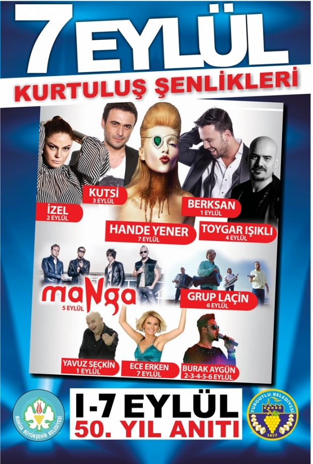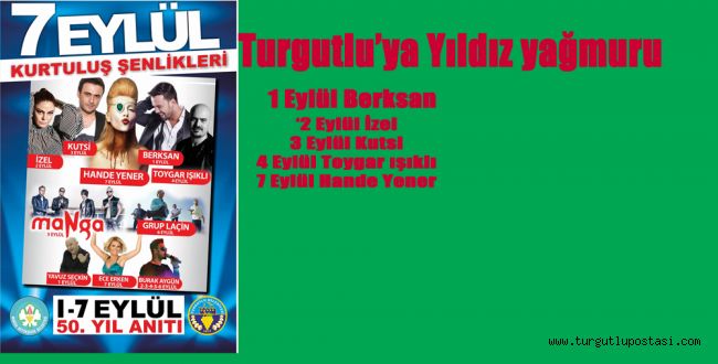 Turgutlu’ya Yıldız YağacakTurgutlu Belediyesi tarafından 1-7 Eylül tarihleri arasında gerçekleştirilecek olan Kurtuluş Şenlikleri kapsamında ilçemizde tam anlamıyla yıldız yağmuru yaşanacak. Kurtuluş Şenlikleri kapsamında 50. Yıl Alanı’nda düzenlenecek konserlerde her akşam birbirinden ünlü sanatçılar sahne alacak. 1 Eylül pazartesi günü başlayacak olan konserlerin programı şöyle: 1 Eylül akşamı Berksan, 2 Eylül’de İzel, 3 Eylül’de Kutsi, 4 Eylül’de Toygar Işıklı, 5 Eylül’de Manga, 6 Eylül’de Grup Laçin, 7 Eylül’de de Hande Yener Turgutlulular ile birlikte olacak. Ayrıca Yavuz Seçkin 1 Eylül’de satand up gösterisiyle; 2, 3, 4, 5 ve 6 Eylül’de Burak Aygün, 7 Eylül’de de Ece Erken sanatçılara eşlik edecek. Manisa Büyükşehir Belediyesi’nin katkılarıyla 50. Yıl Alanı’nda düzenlenecek olan konser programlarının çok yoğun bir ilgiyle gerçekleşeceği tahmin ediliyor.HABER MERKEZİ