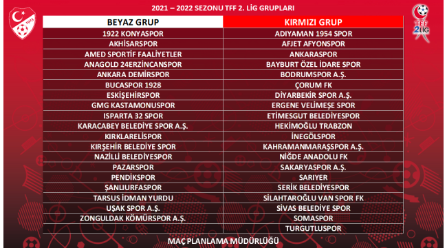 2021-2022 sezonunda TFF 2. Lig; Beyaz ve Kırmızı Grup olarak iki gruba ayrılırken, Kırmızı Grup'ta 20, Beyaz Grup'ta 19 takım yer alıyor. TFF 2. Lig'de yeni sezon 4-5 Eylül'de başlayacak.