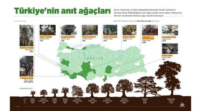 - Çevre, Şehircilik ve İklim Değişikliği Bakanlığı Tabiat Varlıklarını Koruma Genel Müdürlüğünce anıt ağaç olarak tescil edilen Türkiye'nin dört bir tarafındaki binlerce ağaç, özenle korunuyor- AA ekipleri, heybetli görüntüleriyle toprağın derinlerinden göğe uzanan dev ağaçları görüntüledi- Zonguldak'ın Alaplı ilçesinde bulunan 4 bin 117 yaşındaki porsuk ağacı ihtişamıyla göze çarpıyor- Hatay'ın Samandağ ilçesindeki, "Musa Ağacı" olarak bilinen ve Hazreti Musa'nın toprağa dikili olarak unuttuğu asasının yeşermesiyle binlerce yıldır ayakta durduğuna inanılan çınar, bölgeye gelenlerin uğrak noktaları arasında yer alıyor- Muğla'nın Yatağan ilçesinde Pagan inanışının merkezi kabul edilen 3 bin yıllık Lagina Antik Kenti'ndeki 1501 yıllık zeytin ağacı, ziyaretçilere antik kent kalıntılarıyla tarihi yaşamı anımsatıyor