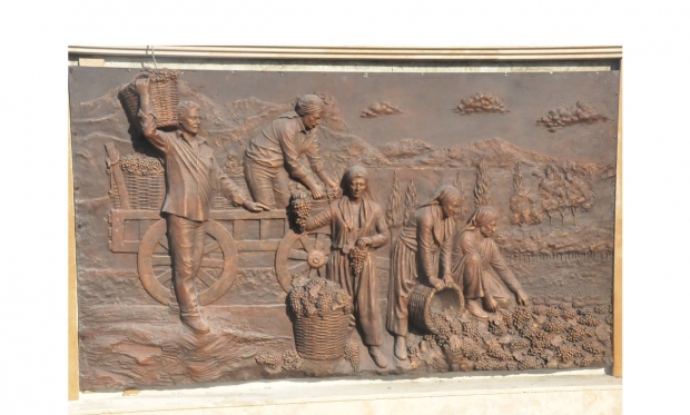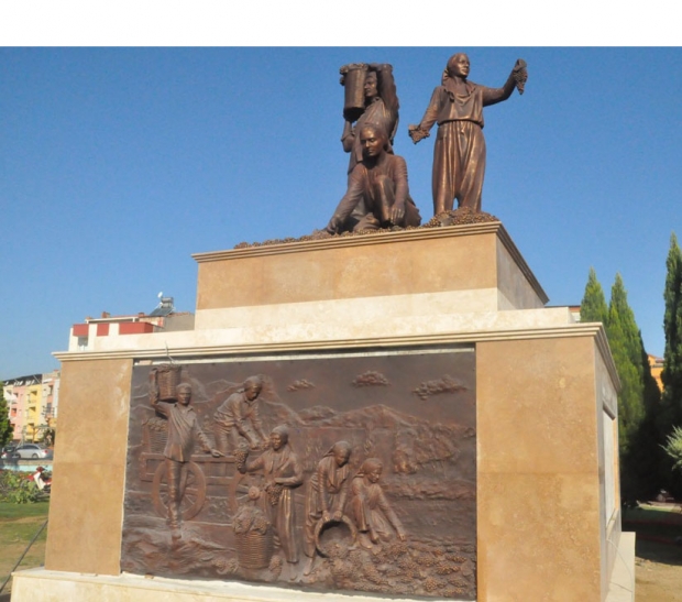 Heykel ve kaidesinde üzüm toplayan insan figürleri var
