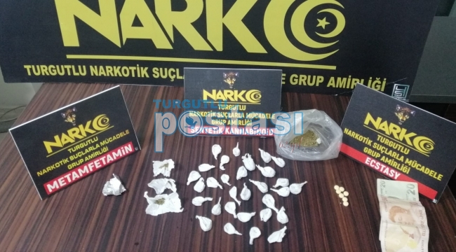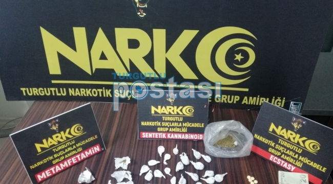 Turgutlu İlçe Emniyet Müdürlüğü Narkotik Suçlarla Mücadele Grup Amirliği görevlilerimizce uyuşturucu veya uyarıcı madde ticareti yapan, nakleden ve kullanan şahıslara yönelik yapılan sokak çalışmaları kapsamında, takibe alınan iki şüpheli şahsı durdurdu. İki şahsın üzerinde ve bir ikamette yapılan aramada, 33 parça halinde Sentetik Kannabinoid (Bonzai) maddesi, şeffaf poşet içerisinde 7 gram Sentetik Kannabinoid maddesi, 7 adet Ecstasy hap, 1 gram Metamfetamin maddesi ile uyuşturucu madde ticaretinden elde edildiği öne sürülen bir miktar para ele geçirildi.