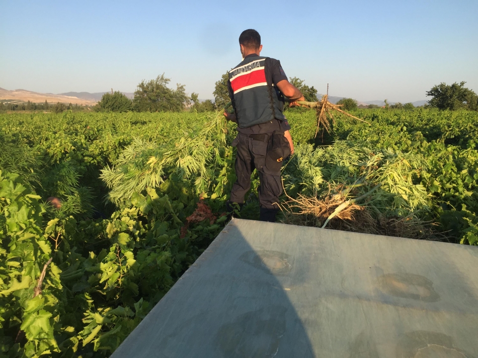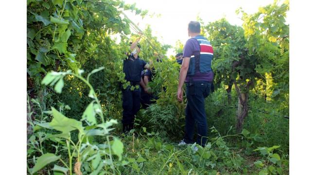 Alaşehir İlçe Jandarma Komutanlığı’na bağlı, Jandarma Suç Araştırma Timi (JASAT) ekipleri, üzüm bağında uyuşturucu yetiştirildiği bilgisini aldı. Harekete geçen ekipler, İllik Mahallesi Ali Ağa mevkisinde üzüm bağı içerisinde asmalar arasına gizlenmiş 1924 kök Hint keneviri ve 5 kilogram kubar esrar ele geçirdi. Ekiplerce toplanan kenevirler, yakılarak imha edildi. Bölgede araştırma yapan jandarma, bağ sahibi M.K.'yı yakalamak için çalışma başlattı. Olayla ilgili soruşturma sürüyor. DHA