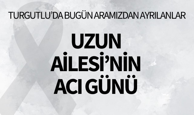 Uzun Ailesi’nin Acı GünüTURGUTLU İlçesi Musalar Yeniköy Mahallesi sakinlerinden Kezban Uzun 58 yaşında hakkın rahmetine kavuştu.Cenazesi bugün öğle namazına müteakip kılınacak cenaze namazının ardından Musalar Yeniköy kabristanda toprağa verilecek.Yakınları: eşi Baki Uzun, oğlu Hasan Uzun, kardeşleri Hamza Dağtekin, Ayşe Ak, Ünzile AktaşMerhumeye Allah'tan rahmet, yakınlarına başsağlığı dileriz.
