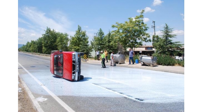 MANİSA'nın Salihli ilçesinde, sürücüsünün kontrolünden çıkan, kasasında iki süt tankeri yüklü kamyonet devrildi. Tankerlerden dökülen süt yolu beyaza bürüdü. Kaza, İzmir Ankara yolu Bülent Ecevit Köprülü Kavşağı yakınlarında meydana geldi. Salihli'den Turgutlu yönüne giden Abdülselam Ç. yönetimindeki 06 KJ 843 plakalı, kasasında iki süt tankeri yüklü kamyonet, sol ön tekerinin patlaması nedeniyle sürücüsünün kontrolünden çıktı. Savrulan kamyonet, devrildi. Sürücü Abdülselam Ç. kazayı yara almadan atlatırken, tankerlerin içindeki yaklaşık 2 ton süt yola döküldü. Kaza nedeniyle, İzmir yönüne ulaşım yaklaşık yarım saat boyunca tek şeritten, kontrollü olarak sağlandı. Sütün dökülmesi ile beyaza bürünen ve kayganlaşan yola, Salihli Belediyesi Temizlik İşleri Müdürlüğü ekipleri kum döktü.Kaza ile ilgili soruşturma başlatıldı.DHA