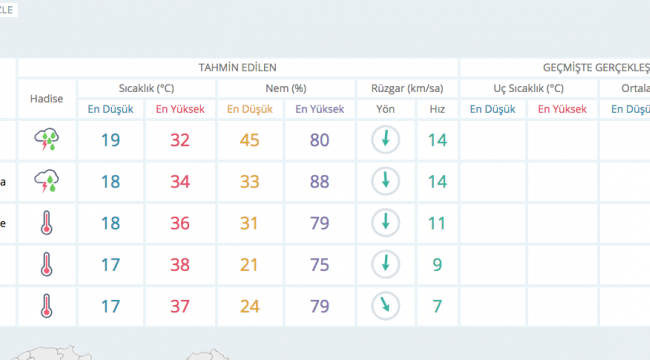 Turgutlu İlçesinde hava durumuBu akşamdan itibaren yağmur bekleniyor. T.C. Tarım Ve Orman Bakanlığı Meteoroloji Genel Müdürlüğü tahminlerine göre ,yağmur Pazartesi akşamı başlayacak yağmur ,çarşamba akşamına kadar devam edecek .Hava sıcaklıkları ise en düşük 18 derece , en yükse sıcaklık ise 34 derece kadar gösterilmekte. Nurullah Çankaya