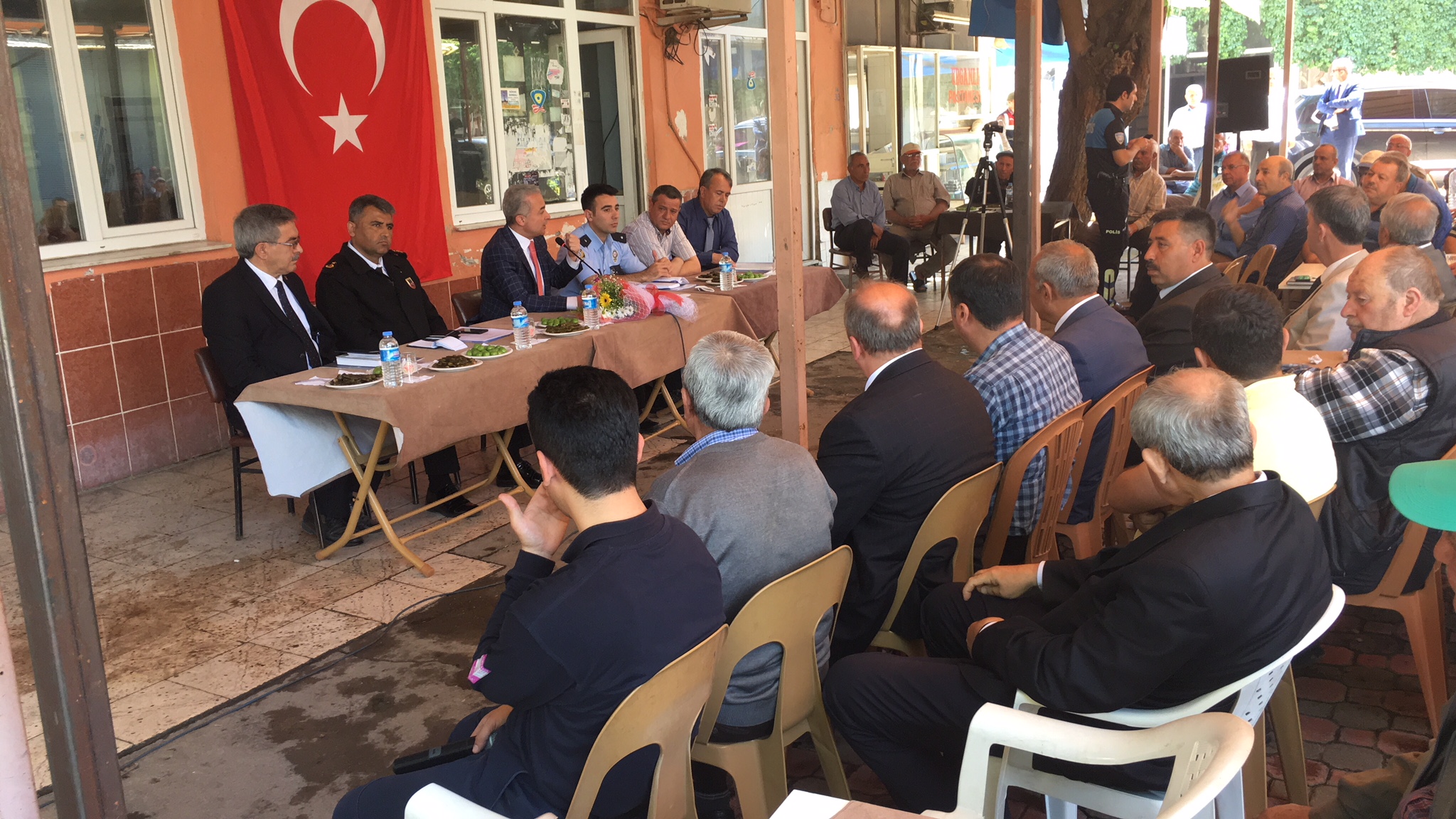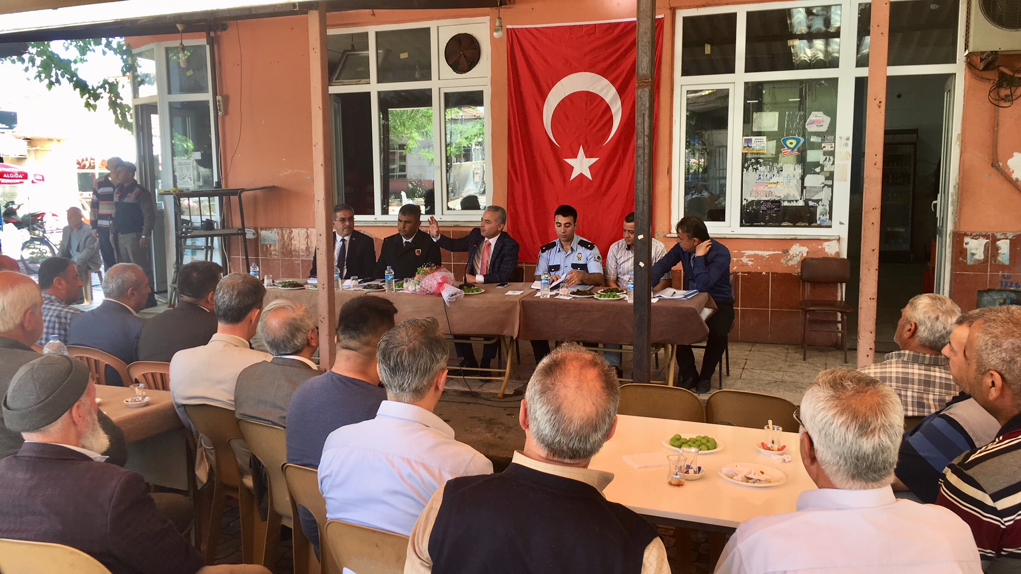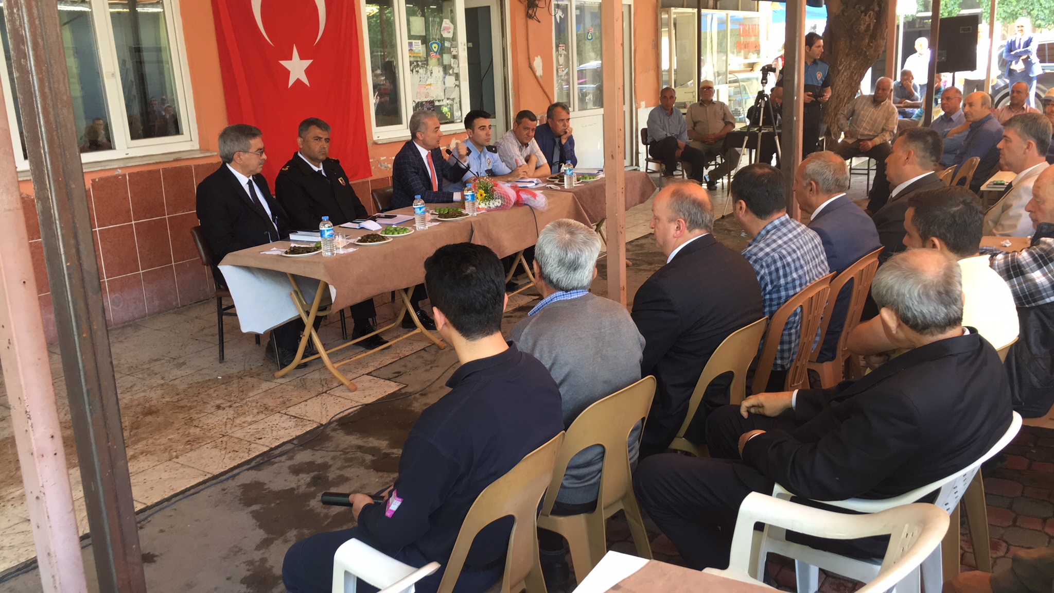 TURGUTLU Kaymakamlığının her ay düzenlediği güvenlik toplantısı. Turgutlu’nun Urganlı Mahallesi’nde bir kahvehane bahçesinde yapıldı.