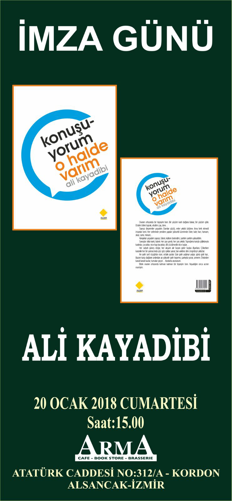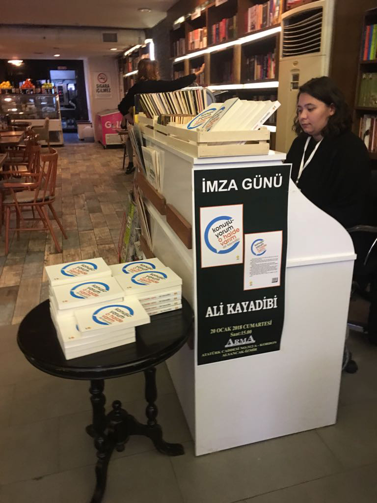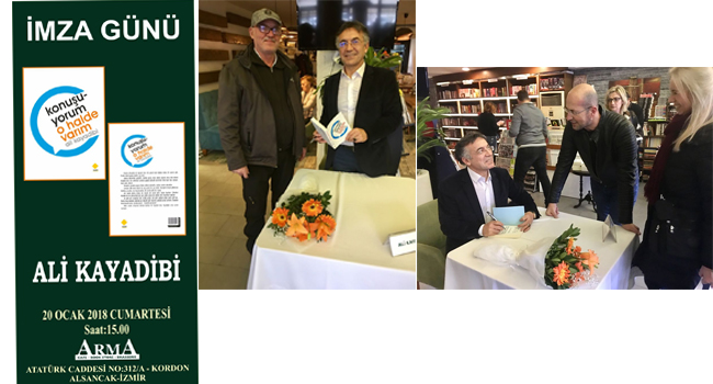 Basın ve iletişim. dünyasında 35 yılı geride bırakan gazeteci,eğitimci, yazar Ali Kayadibi, “Konuşuyorum o halde varım” kitabını okuyucularına imzaladı. 20 Ocak 2018 Cumartesi günü İzmir Arma Cafe-Book Strore’da kitaplarını imzalayan Kayadibi,”Konuşmayı, varlık sürdürme biçiminin en belirgin göstergesi olarak niteledi.Kayadibi, şunları söyledi “Gelişen iletişim teknolojileri, insanla insanın ilişkisini sınırlayıcı etkisini fark etmemizi de engelliyor. Etkili konuşmanın günümüzde daha fazla ihtiyaç haline geldiğini hatırlatmak; kendimizi bu yönde geliştirmenin yollarını göstermek için bu kitabı yazdım”