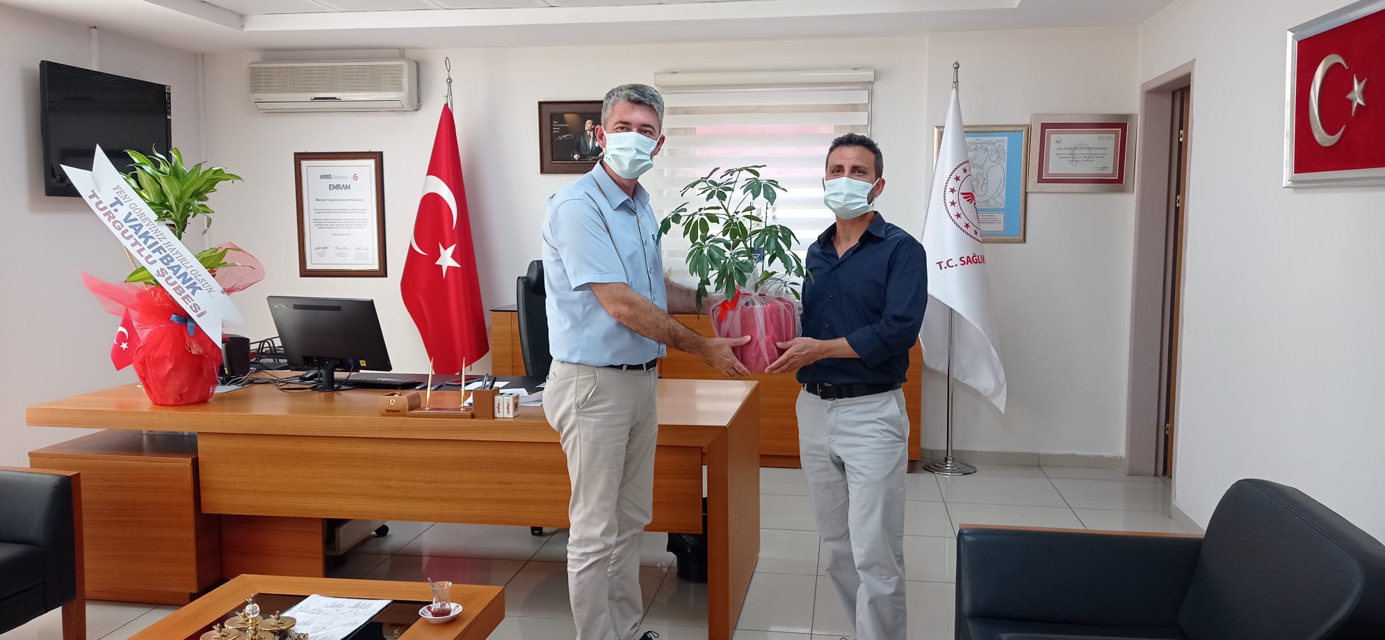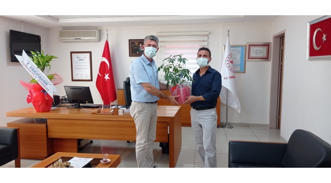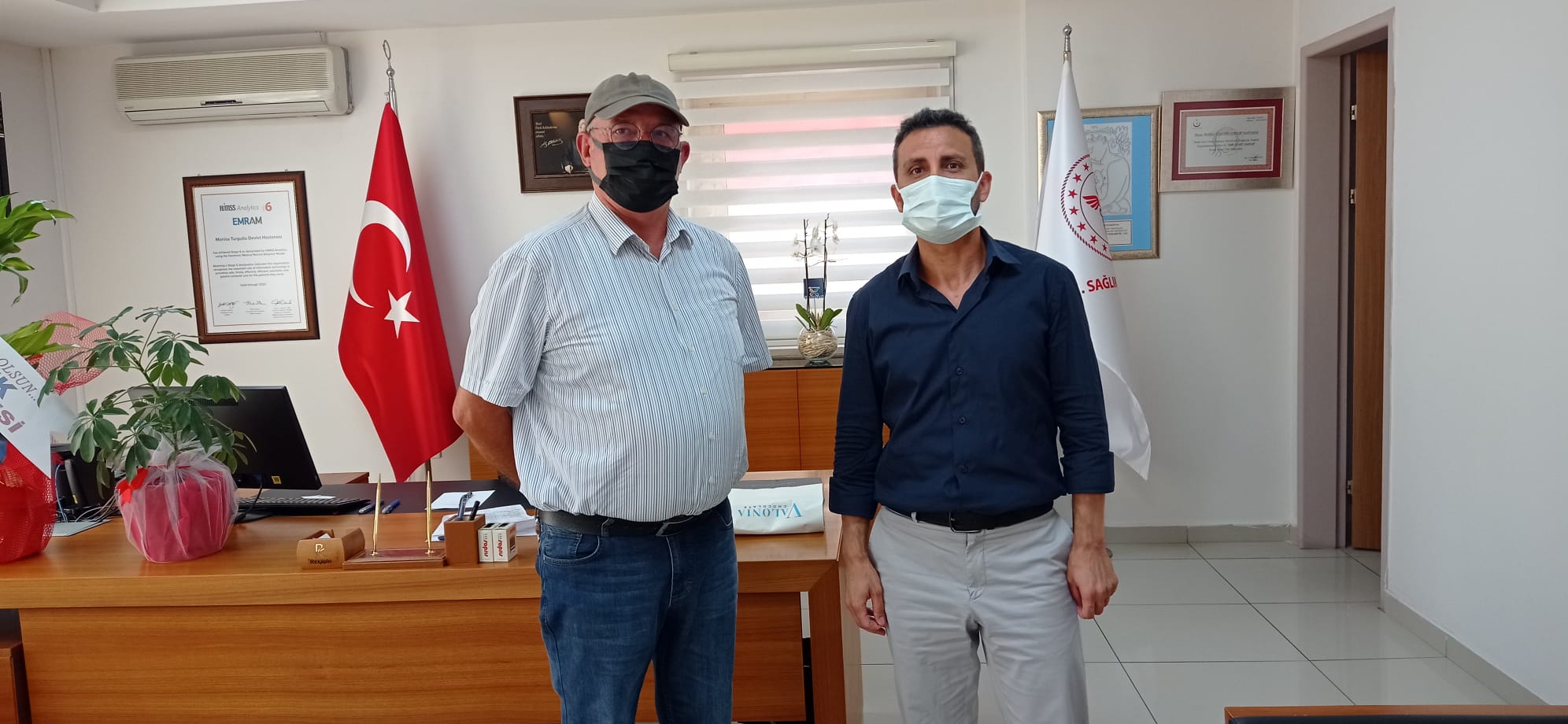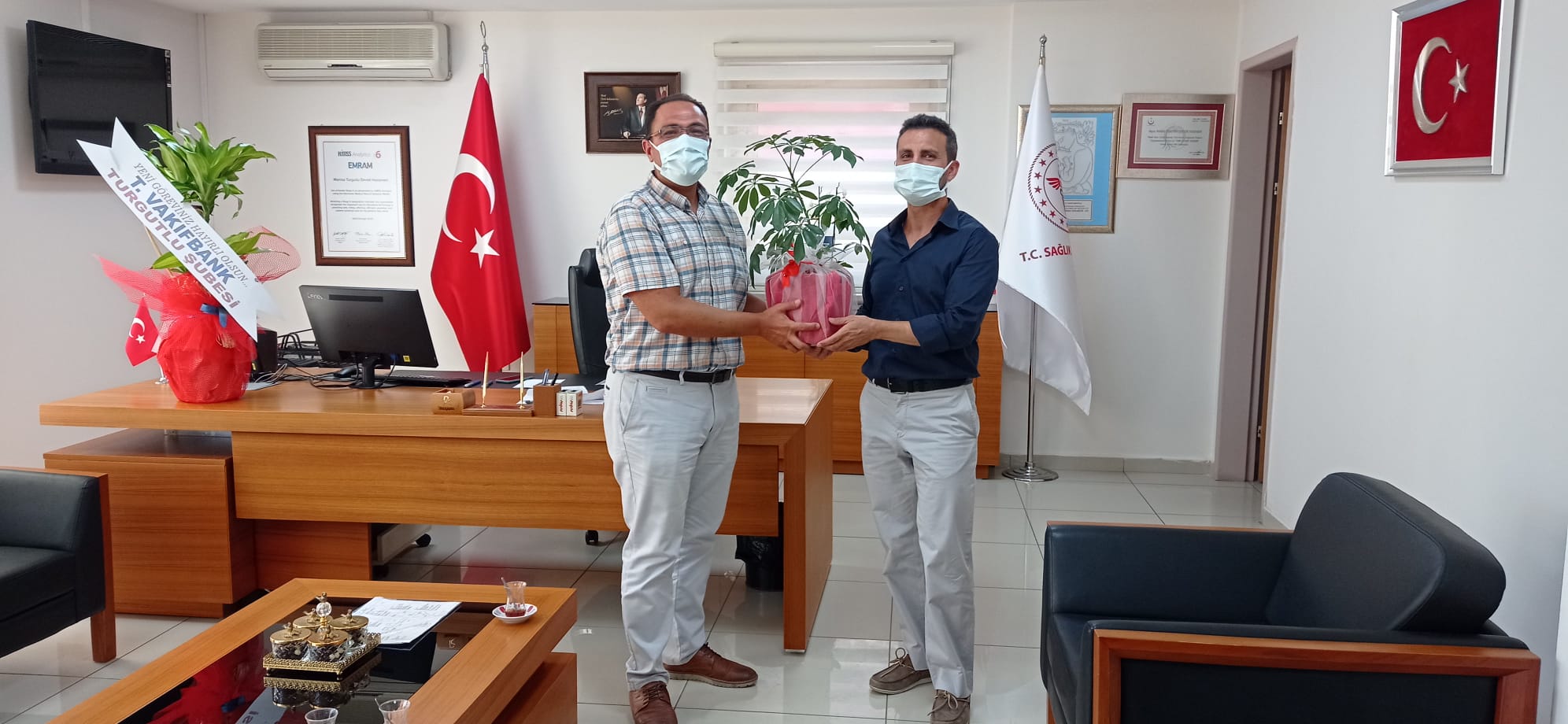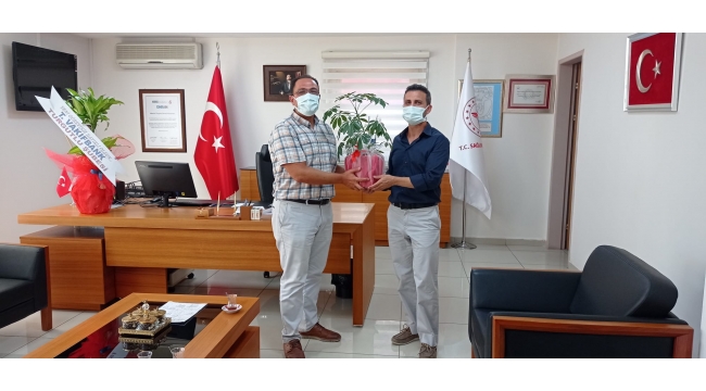 YENİ BAŞHEKİM ÖZŞAHİNE TEBRİK ZİYARETLERİTurgutlu Devlet Hastanesi’nde Başhekim olarak göreve başlayan Op. Dr. Murat Özşahin’e tebrik ziyaretleri devam ediyorTemmuz ayında göreve başlayan Op. Dr. Murat Özşahin’e bugün de Turgutlu İlçe Sağlık Müdürü Dr Bilgehan Hasyiğit ile Turgutlu Diş Hastanesi Başhekimi Güven Tahtacı ziyaret ederek görevlerinde başarılar diledi. İlçe Sağlık Müdürü Hasyiğit yeni atanan Başhekim yardımcılarına da tebrik ederek cukulata ikram etti. Görevine yeni atanan Özşahin “ Buraya bir şeyler yapmaya geldik. Görevimiz sorunları çözmek vatandaşa hizmet etmek, korona önlemleri elimiz kolumuzu bağlıyor . Umarım önümüzdeki ay sonuna kadar önümüzü görüp kolları sıvamak istiyoruz “ Doğan ÇİZMECİ