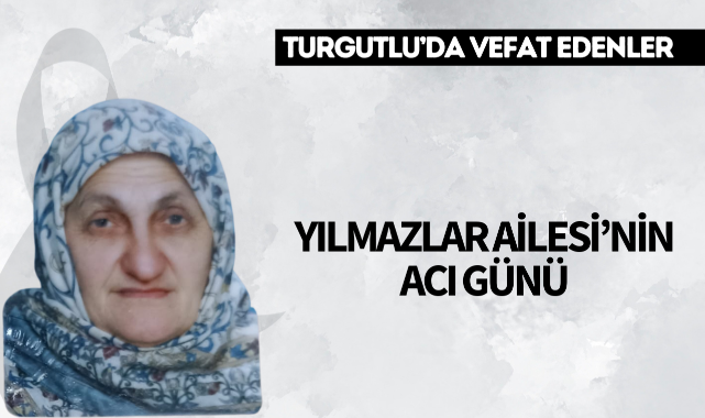 Yılmazlar Ailesi’nin Acı GünüTURGUTLU İlçesi sakinlerinden merhum Keresteci Hacı Mustafa Yılmazlar’ın eşi Gülhanım Yılmazlar, 94 yaşındaki hakkın rahmetine kavuştu.Cenazesi yarın öğle namazına müteakip Selvilitepe Niyazi Üzmez Camii’nde kılınacak cenaze namazının ardından yeni kabristanda toprağa verilecek.Yakınları: oğulları iş güvenliği uzmanı Mustafa Yılmazlar, keresteci İbrahim Yılmazlar, eski İmam Hatip Lisesi Camii imamı merhum Hüseyin YılmazlarMerhumeye Allah’tan rahmet, yakınlarına başsağlığı dileriz.